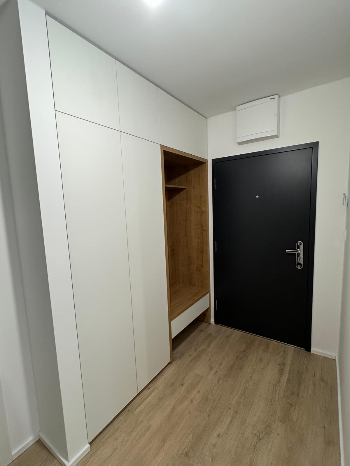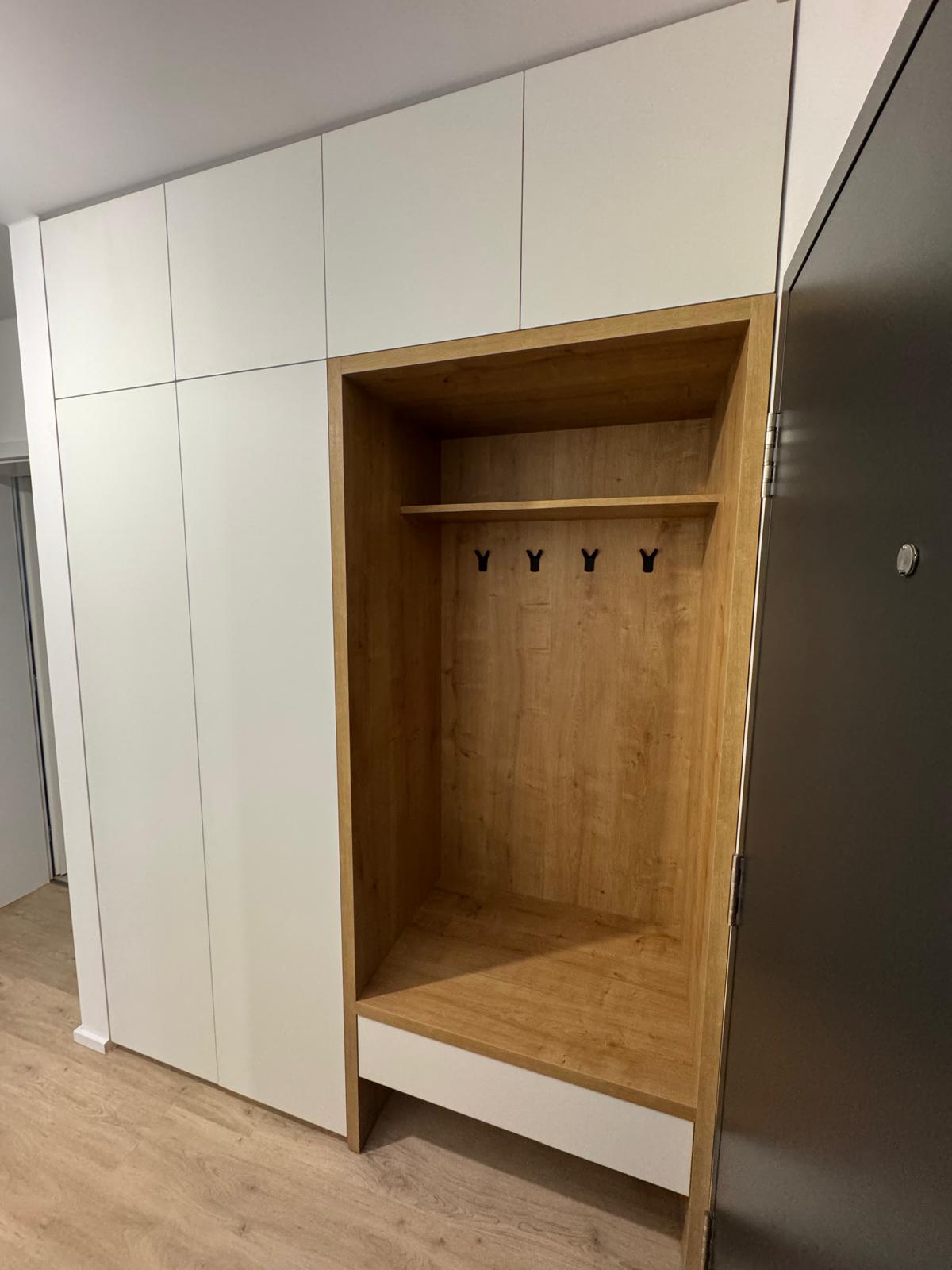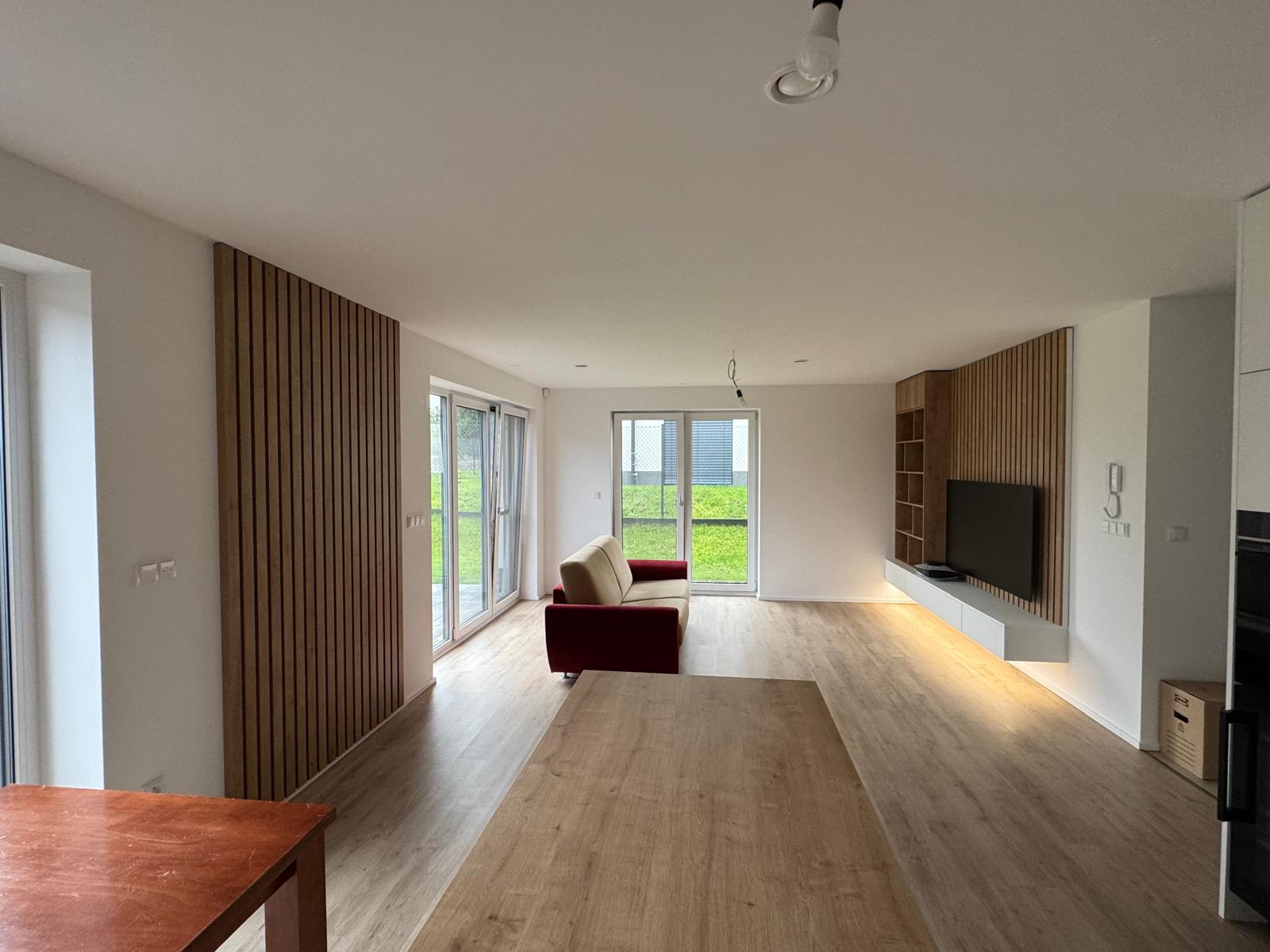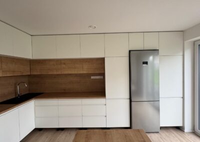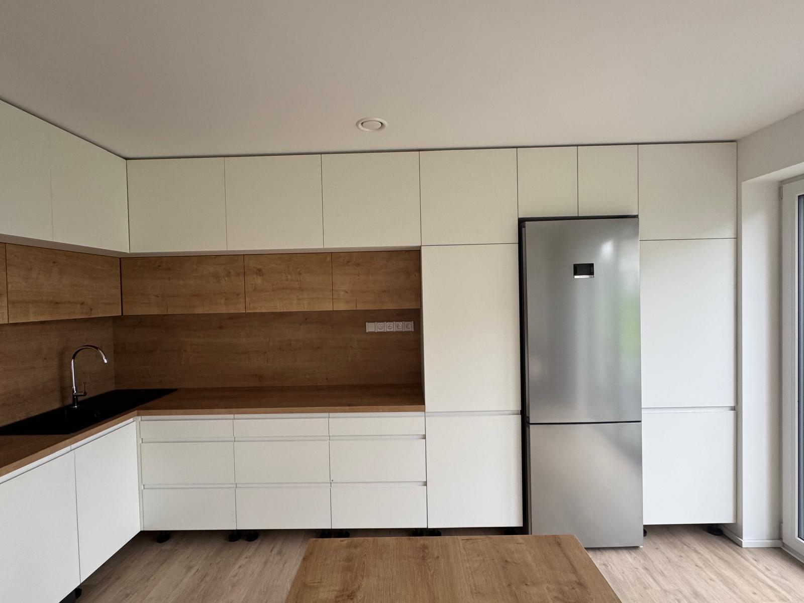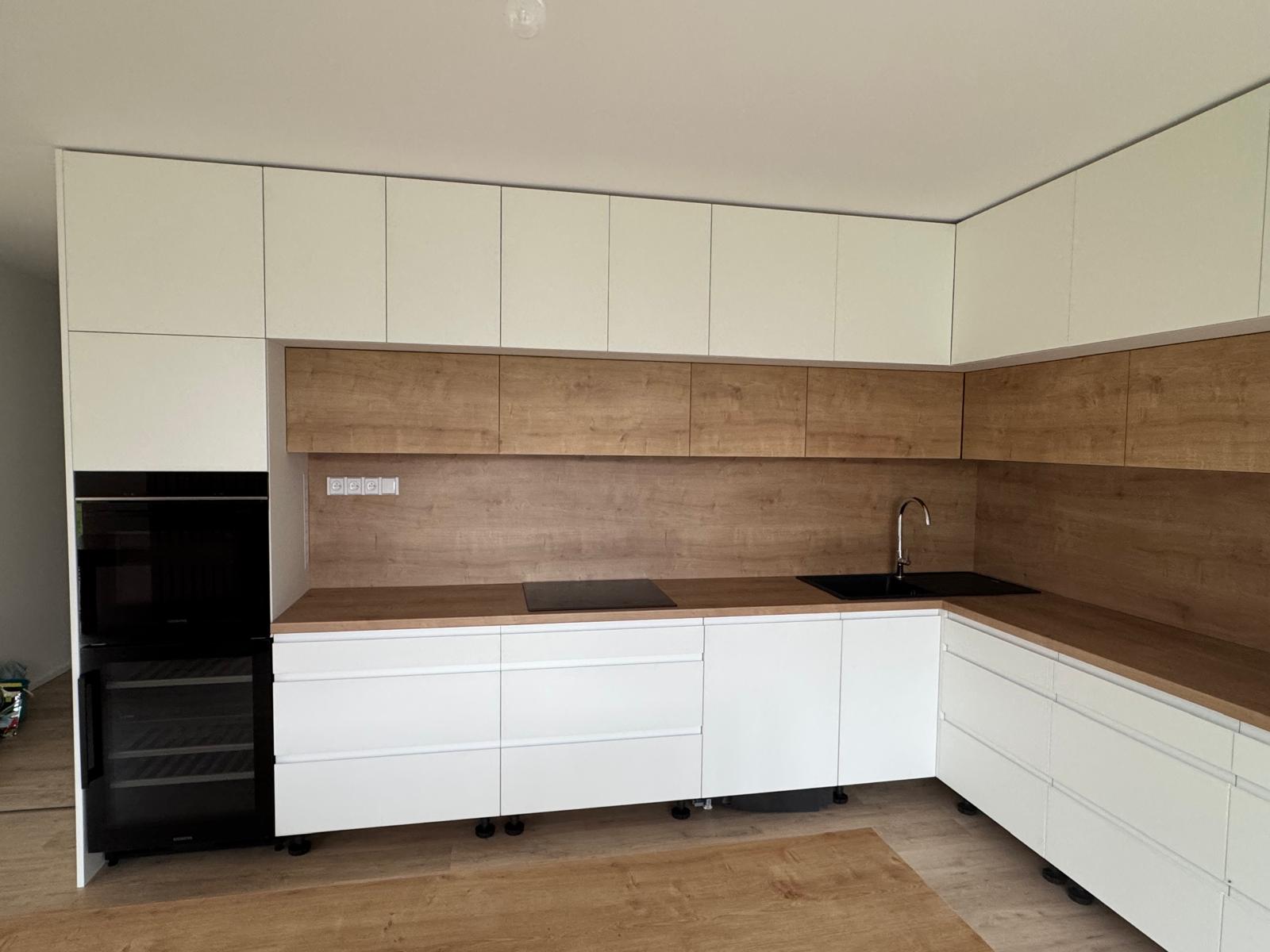 Rohová kuchyňská linka spojená s obývacím pokojem. Pracovní část linky je oddělena nízkým pultem od sedací soupravy. Linka je navržena v kombinaci bílé matné a dezénu přírodního dřeva s černými spotřebiči.