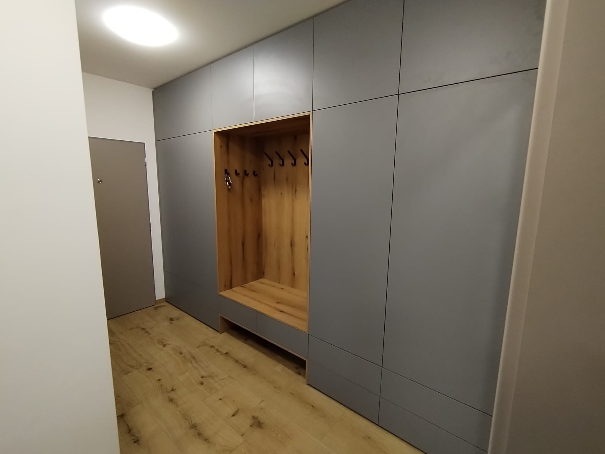 Moderní obývací stěna navržena v kombinaci antracit a dezénu dřeva. Zajímavým prvkem je dřevěný rošt na stěně, který dotváří celkový dojem místnosti.